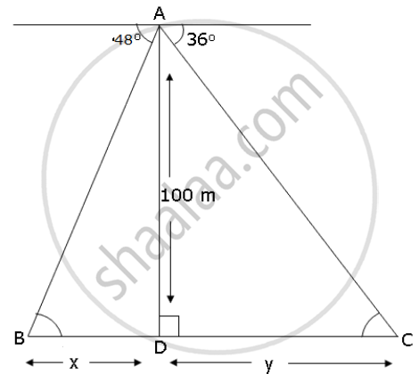 From the top of a lighthouse, 100 m high the angles of depression of two ships on opposite sides of it are 48° and 36° respectively. Find the distance between the two ships to the nearest metre.