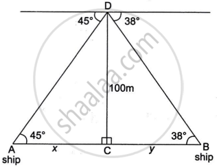 From the top of a tower 100 m high a man observes the angles of depression of two ships A and B, on opposite sides of the tower as 45° and 38° respectively. If the foot of the tower and the ships are in the same horizontal line find the distance between the two ships A and B to the nearest metre.