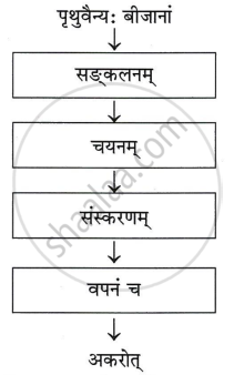 तदा पृथुभूपेन तदर्थं धनुः सज्जीकृतम्। तदा भूमिः स्त्रीरूपं धृत्वा तस्य पुरतः प्रकटिता अभवत् अवदत् च, “हे राजेनद्र! तव पिता दुःशासकः वेनराजः राजधर्मस्य पालनं नाकरोत्। तदा मया चोरलुण्ठकभयात् धनधान्यपुष्पफलानि मम उदरे निहितानि। त्वं तु प्रजाहितदक्षः नृपः। यदि त्वं प्रयत्नेन कृषिकार्यं करोषि तर्हि अहं प्रसन्ना भविष्यामि। अतः धनुः त्यज।खनित्राणि, हलान्, कुदालकान् लवित्राणि च हस्ते गृहीत्वा प्रजाजनैः सह कृषिकार्यं कुरु।” भूमातुः उपदेशं मनसि निधाय पृथुवैन्यः नदीनां मार्गम् अवरुध्य कृषिकारयार्थं जलस्य उपयोगम् अकरोत्। वृष्टिजलसञ्जयं कृत्वा जलव्यवस्थापनम् अकरोत्। भूमिम् उर्वरतमां कर्तु प्रायतत। तदनन्तरं तस्मिन् क्षेत्रे जनाः धान्यबीजानि अवपन्। स नैकेभ्यः वृक्षेभ्यः विविधप्रकारकाणां बीजानां सङ्कलनं चयनं च परिश्रमेण अकरोत्। अनन्तरं बीजानां संस्करणं कृत्वा वपनम् अकरोत्। पर्जन्यानन्तरं बीजेभ्यः अङ्कुराः उद्भूताः। |