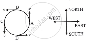 A particle travelling anticlockwise in a circular path with a constant speed v in a horizontal plane. The particle travels in the same amount of time (t = T/4) across each quarter of circles AB, BC, CD, and DA, where T is the particle's round-trip time on the circular path. Particle speed is therefore constant. However, at various places throughout the circular course, the particle's force direction of motion varies.