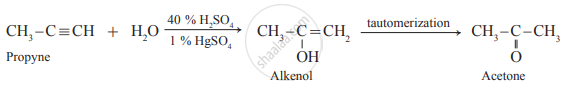 Acetone: On passing propyne through warm 40% H2SO4 in the presence of 1% HgSO4, alkenol is obtained which on tautomerization form acetone.