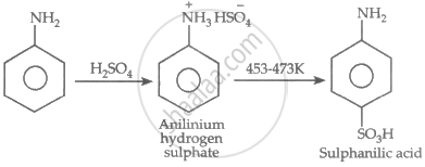 Aniline reacts with concentrated sulphuric acid to form anilinium hydrogen sulphate which on heating with sulphuric acid at 453 − 473 K produces sulphanilic acid.