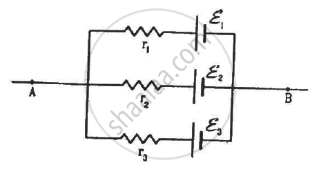 In the circuit shown in the figure, ε1 = 3 V, ε2 = 2 V, εa = 1 V and r1 = r2 = r3 = 1Ω. Find the potential difference between the points A and B and the current through each branch.