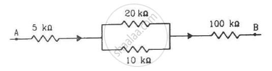 The following figure shows a part of a circuit. If a current of 12 mA exists in the 5 kΩ resistor, find the currents in the other three resistors. What is the potential difference between the points A and B?