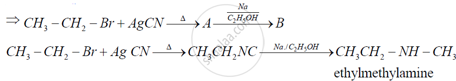 \[\ce{CH3 - I ->[Alc. KCN][\Delta] A ->[Na/C2H5OH] B}\]