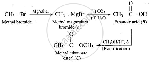 \[\ce{CH3 - Br ->[Mg/ether] (A) ->[(i) CO][(ii) Water] (B) ->[CH3OH/H+][Δ] (C)}\]