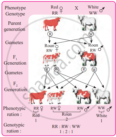 - Roans have the mixture of red and white colour hair. Thus both the traits are expressed equally. In F2 generation red (RR), roans (RW) and white (WW) are produced in the ratio 1 : 2 : 1. Thus in Co-dominance, the genotypic and phenotypic ratios are identical.