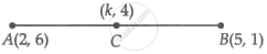 If the point C(k, 4) divides the line segment joining two points A(2, 6) and B(5, 1) in ratio 2 : 3, the value of k is `underlinebb(16/5)`.