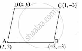 Let A(2, 2), B(– 2, – 3), C(1, – 3) and D(x, y) are the vertices of a parallelogram.