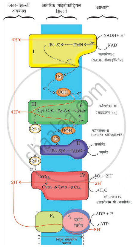 - अंतिम इलेक्ट्रॉन स्वीकर्ता के रूप में, ऑक्सीजन हाइड्रोजन परमाणुओं की सहायता से पानी में अवकाशित हो जाता है। अवकाशित कोएंजाइम्स, जैसे कोएंजाइम I, II, और FAD, सीधे O2 अणु के साथ प्रतिक्रिया नहीं करते; बल्कि, उनके हाइड्रोजन या इलेक्ट्रॉन विभिन्न पदार्थों के माध्यम से O2 तक पहुँचने से पहले प्रेषित होते हैं। इन पदार्थों को इलेक्ट्रॉन कैरियर कहा जाता है।