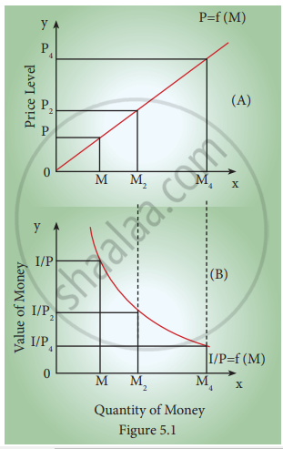 - Figure (B), shows the inverse relationship between the quantity of money and the value of money, where the value of money is taken on the vertical axis. When the quantity of money is OM1, the value of money is 01/P1. But with the doubling of the quantity of money to OM2, the value of money becomes one–half of what it was before, (01/P2). But, with the quantity of money increasing fourfold to OM4, the value of money is reduced by 01/P4. This inverse relationship between the quantity of money and the value of money is shown by the downward sloping curve 1/OP = f (M).