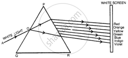In figure AO is the ray of white light falling on a prism PQR. Complete the diagram till the light emerges out from the prism and falls on the screen.