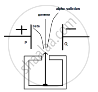 In the following fig. shows a radioactive source S in a thick lead container. The radiations pass through an electric field between the plates P and Q. Complete the diagram to show the paths of α , β and γ radiations.