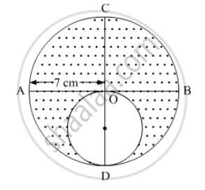 In the following figure, AB and CD are two diameters of a circle perpendicular to each other and OD is the diameter of the smaller circle. If OA = 7 cm, find the area of the shaded region.