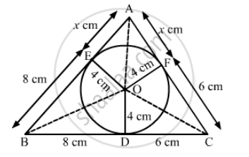 In the given figure, a ∆ABC is drawn to circumscribe a circle of radius 4 cm such that the segments BD and DC are of lengths 8 cm and 6 cm respectively. Find the lengths of sides AB and AC, when area of ∆ABC is 84 cm2.