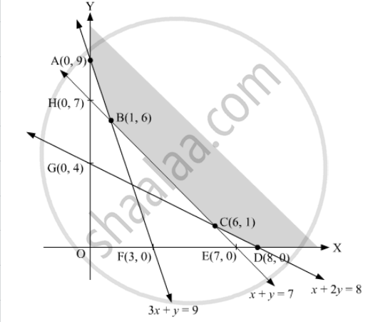 This shaded region repressents the feasible region of the given linear programming problem. The corner points of the feasible region are A(0, 9), B(1, 6), C(6, 1) and D(8, 0).