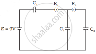 In the circuit shown in figure, initially K1 is closed and K2 is open. What are the charges on each capacitors.
