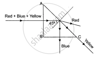 In the diagram, a narrow beam of white light is incident on a right-angled isosceles prism. The critical angle of the material of prism for the yellow colour of white light is 45°. Complete the diagram to show the path of blue, yellow, and red colours of white light till they emerge out of the prism.