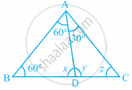 ∠BAD = 60°, ∠ABD = 60°, ∠ADB = x, ∠DAC = 30°, ∠ADC = y and ∠ACD = z