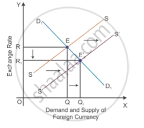 (b) Foreign investments will lead to a rise in the supply of foreign currency. Hence, the supply will tend to shift from SS to S′S′ and the new equilibrium point will be reached at Point E′. The exchange rate declines from OR to OR because the demand and supply of foreign currency increases to OQ1.