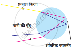 (c) पानी की सूक्ष्म बूँदे प्रिज्म की तरह कार्यकरती है। जब वायुमंडल की पानी की सूक्ष्म बूँदों में प्रकाश किरण प्रवेश करती है तब पानी की बूँदों द्वारा सूर्यप्रकाश का अपवर्तन और विक्षेपण होता है, उसके पश्चात् बूँद के अंदर आंतरिक परावर्तन होता है और अंत में बूँद से बाहर आते समय पुनः अपवर्तन होता है। इन सभी प्राकृतिक घटनाओं का एकत्रित परिणाम सप्तरंगी इंद्रधनुष्य के रूप में देखने को मिलता है।