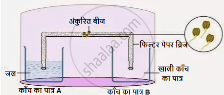 दो छोटे काँच का पात्र लें और उन्हें A और B के रूप में चिह्नित करें। काँच का पात्र A को पानी से भरें। अब एक फिल्टर पेपर से एक बेलनाकार रोल बनाएं और इसे काँच का पात्र A और काँच का पात्र B के बीच एक पुल के रूप में रखें, जैसा कि चित्र में दिखाया गया है। फिल्टर पेपर के पुल के बीच में कुछ अंकुरित बीज लगाएँ। अब पूरे सेटअप को एक पारदर्शी प्लास्टिक कंटेनर से ढक दें ताकि नमी बनी रहे।
