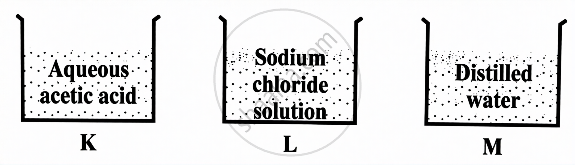 K, L and M are beakers containing three different solutions as shown below.