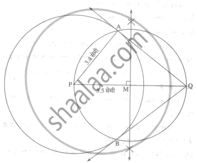 केंद्र P तथा त्रिज्या 3.4 सेमी लेकर एक वृत्त खींचिए। वृत्त के केंद्र से 5.5 सेमी दूरी पर एक बिंदु Q लीजिए। Q से वृत्त की स्पर्श रेखा खींचिए।