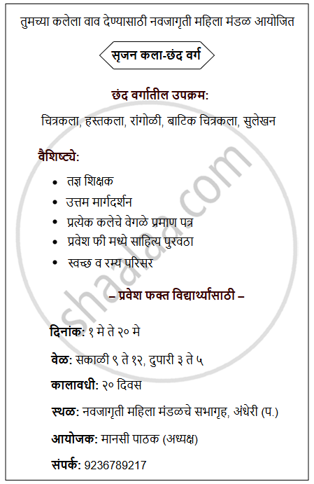खालील मुद्द्यांच्या आधारे ‘कला-छंद वर्ग’ याची आकर्षक जाहिरात तयार करा.