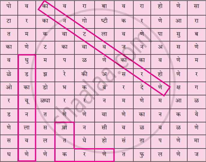 खालील शब्दकोड्यात काही शब्दसमूह लपलेले आहेत ते शोधा व त्यांची यादी तयार करा. उदा. धुडकावून लावणे.