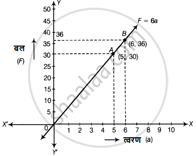 किसी गाड़ी को खींचने में लगाया गया बल उस गाड़ी (पिंड) में उत्पन्न किए गए त्वरण के अनुक्रमानुपाती है। इस कथन को दो चारों वाले एक रैखिक समीकरण के रूप में व्यक्त कीजिए तथा अचर द्रव्यमान 6 kg लेकर, इसका आलेख खींचिए आलेख से वाँछित बल ज्ञात कीजिए, जब उत्पन्न त्वरण (i) 5 m/sec² है, (ii) 6 m/sec² है।