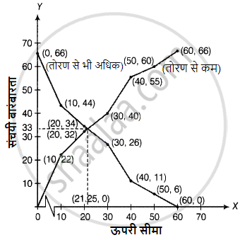 सबसे पहले, हम दोनों तोरणों के प्रतिच्छेदन बिंदु पर X-अक्ष के समानांतर एक रेखा खींचते हैं, जो आगे Y-अक्ष पर (0, 33) पर प्रतिच्छेद करती है। अब, हम दोनों तोरणों के प्रतिच्छेदन बिंदु पर एक्स-अक्ष पर लंबवत एक रेखा खींचते हैं, जो आगे चलकर एक्स-अक्ष पर (21.25, 0) पर प्रतिच्छेद करती है, जो तोरणों का उपयोग करके आवश्यक माध्यिका है।