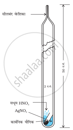 \[\ce{\text{हैलोजेनयुक्त कार्बनिक यौगिक} + HNO3 -> \underset{\text{हैलोजेन अम्ल}}{HX}}\] [X = Cl, Br, I]