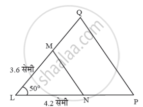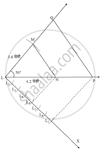 ΔLMN ∼ ΔLQP. ΔLMN मध्ये, LM = 3.6 सेमी, ∠L = 50°, LN = 4.2 सेमी आणि `"LM"/"LQ" = 4/7`. तर ΔLQP काढा.
