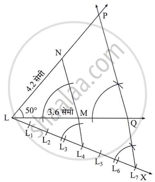 ΔLMN ~ ΔLQP. ΔLMN में LM = 3.6 सेमी, ∠L = 50°, LN = 4.2 सेमी तथा `(LM)/(LQ) = 4/7` हो, तो ΔLQP की रचना करो।