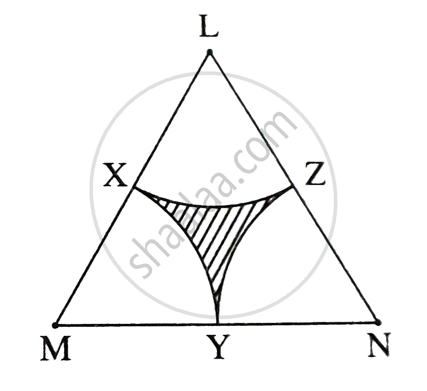ΔLMN समबाहु त्रिभुज है। LM = 14 सेमी. त्रिभुज के प्रत्येक शीर्ष बिंदु को केंद्र मानकर तथा 7 सेमी त्रिज्या लेकर आकृति में दर्शाएनुसार तीन द्वैत्रिज्य खींचकर उसके आधार पर,