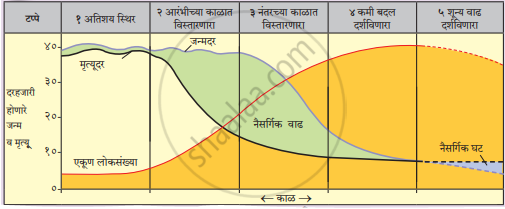 लोकसंख्या संक्रमण सिद्धांताची आकृती काढा व योग्य नावे द्या.