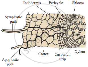 - Water passes through the epidermal cell (epiblema), cortex, endodermis, Casparian strip, pericycle and then to the protoxylem.