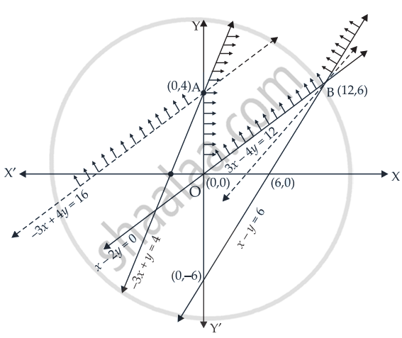 Maximise and Minimise Z = 3x – 4y subject to x – 2y ≤ 0, – 3x + y ≤ 4, x – y ≤ 6, x, y ≥ 0