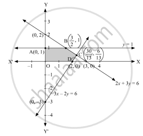 Converting the given inequations into equations, we get 2x + 3y = 6, 3x − 2y = 6, y = 1, x = 0 and y = 0. These lines are drawn on the graph and the shaded region OABCD represents the feasible region of the given LPP.