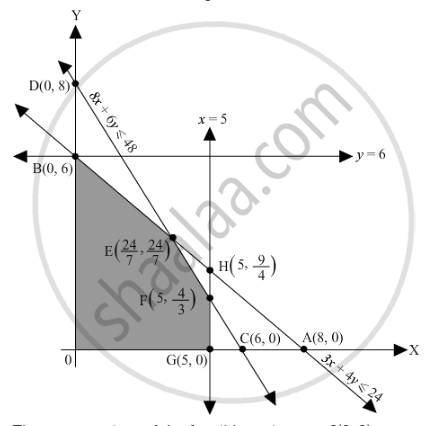 The corner points of the feasible region are O(0, 0), \[G\left( 5, 0 \right)\], \[F\left( 5, \frac{4}{3} \right)\] , \[E\left( \frac{24}{7}, \frac{24}{7} \right)\] and \[B\left( 0, 6 \right)\] The values of Z at these corner points are as follows.