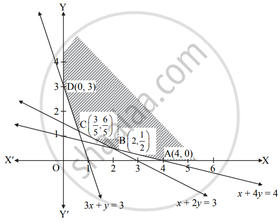 Shaded portion XABCDY is the feasible region, whose vertices are A(4, 0), B, C and D(0, 3).