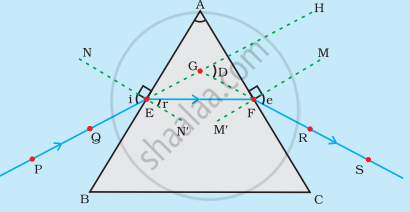 नामांकित किरण आरेख का उपयोग करके किसी काँच के त्रिभुजाकार प्रिज्म से होने वाले प्रकाश के अपवर्तन को स्पष्ट कीजिए। इस प्रकार विचलन कोण की परिभाषा लिखिए।