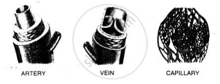 Name the three kinds of blood vessels found in human beings. With the help of suitable diagrams, differentiate between them.