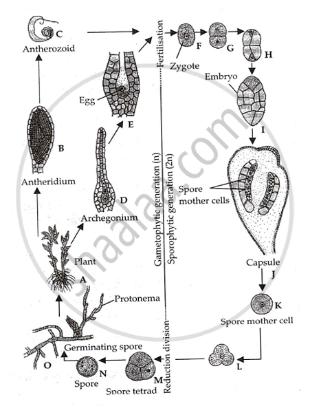 by fragmentation; by the buds formed in secondary protonema, etc. The sex organs, antheridia and archegonia are produced in dusters at the apices of the leafy shoots. Antheridia produces antherozoids and archegonia produces egg. Antherozoid (male gamete) and egg (female gamete) fuse and form zygote. Zygote develops into a sporophyte; which is differentiated into foot, seta and capsule, and spores are produced in the capsule.