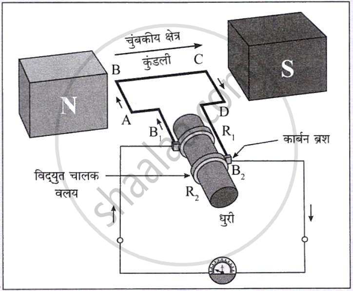 परंतु भुजा CD ब्रश B2 के संपर्क में तथा भुजा AB ब्रश B1 के संपर्क में होने के कारण बाह्य परिपथ में विद्युतधारा B1 → G → B2 इस प्रकार प्रवाहित होती है। - यह क्रिया नियमित रूप से निरंतर तथा बार-बार होती है। इस प्रकार यह प्रेरित विद्युतधारा प्रत्यावर्ती स्वरूपवाली होने के कारण इसे ‘प्रत्यावर्ती विद्युतधारा’ (AC) कहते हैं।