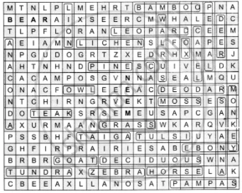 नीचे दी गई वर्ग पहेली में शब्द छिपे हैं। ये सब वनस्पतियों एवं वन्य जीवों से संबंधित हैं। ये शब्द क्षैतिज एवं उर्ध्वाधर रूप में दिए गए हैं। इनसे दो शब्दों की पहचान आपके लिए की गई है। अपने दोस्त से मिलकर बाकी शब्दों की पहचान करें।