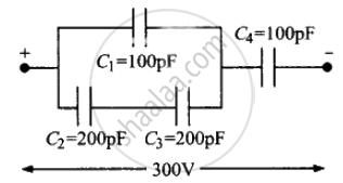 निचे दिए गए चित्र के नेटवर्क (जाल) की तुल्य धारिता प्राप्त 100 pF कीजिए। 300 V संभरण (सप्लाई) के साथ प्रत्येक संधारित्र का आवेश व उसकी वोल्टता ज्ञात कीजिए।