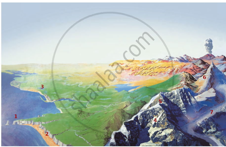 निम्न चित्र का ध्यानपूर्वक निरीक्षण कीजिए। बाहय कारकों से निर्मित हुए भूरूप पहचानिए। उन्हे पेंसिल से क्रमांक देकर उनके नाम दिए गए क्रम के अनुसार कापी में लिखिए: