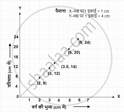 हम x-अक्ष पर एक वर्ग की भुजा और y-अक्ष पर उस वर्ग की परिधि को दर्शा सकते हैं। दिए गया ग्राफ इस प्रकार बनाया गया है: